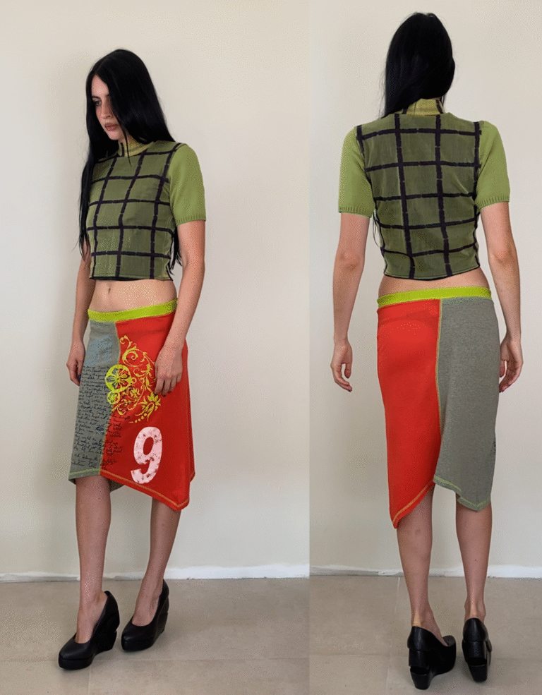 Materials: (have been unfortunately cut the main printed pannel seems to be some organza type of fabric with synthetic lining. Sleeves are knitted cotton