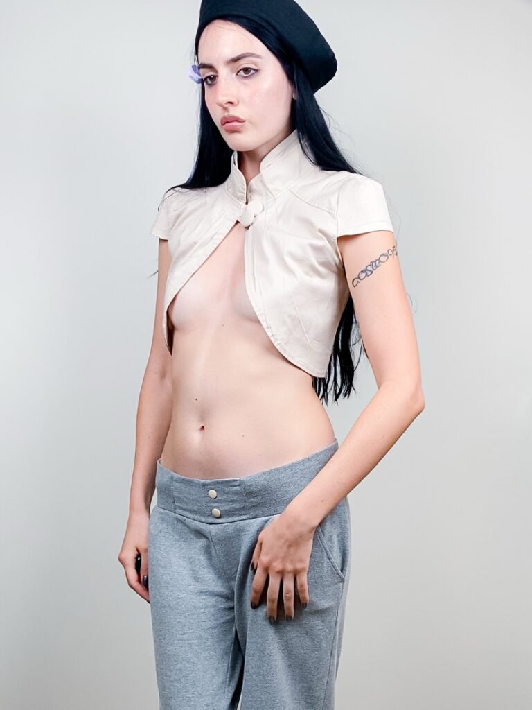 Cutest high neckline bolero in beige color, closing with buttons.
