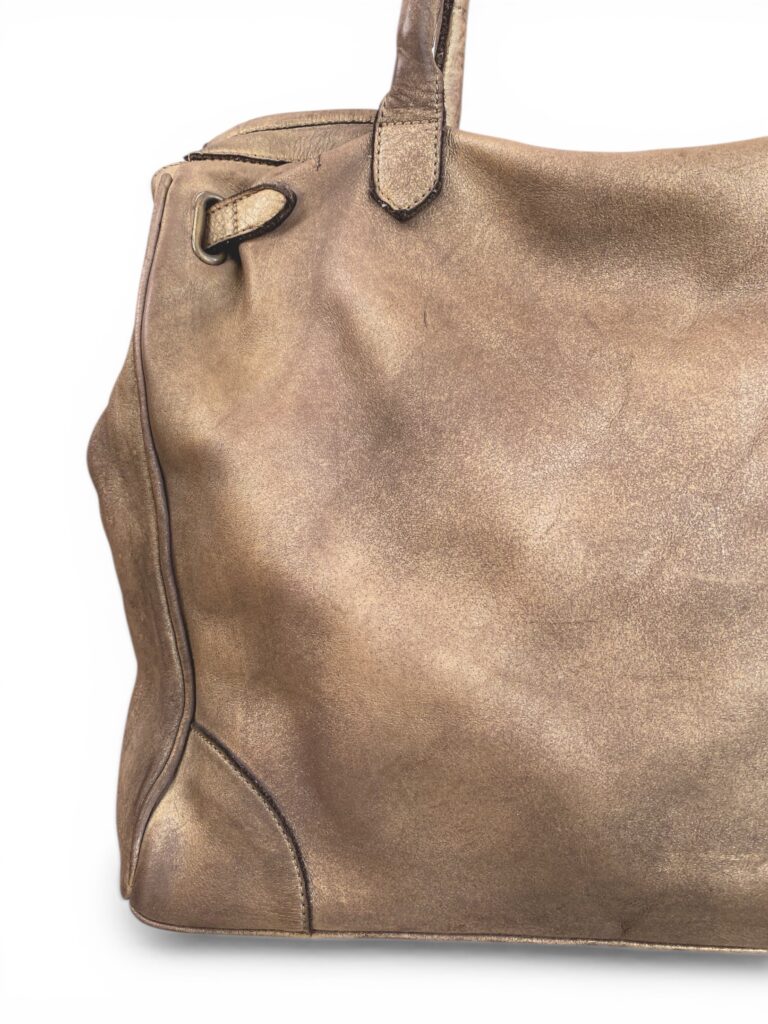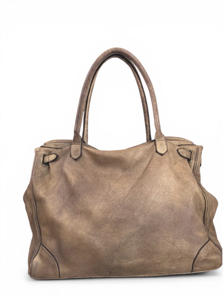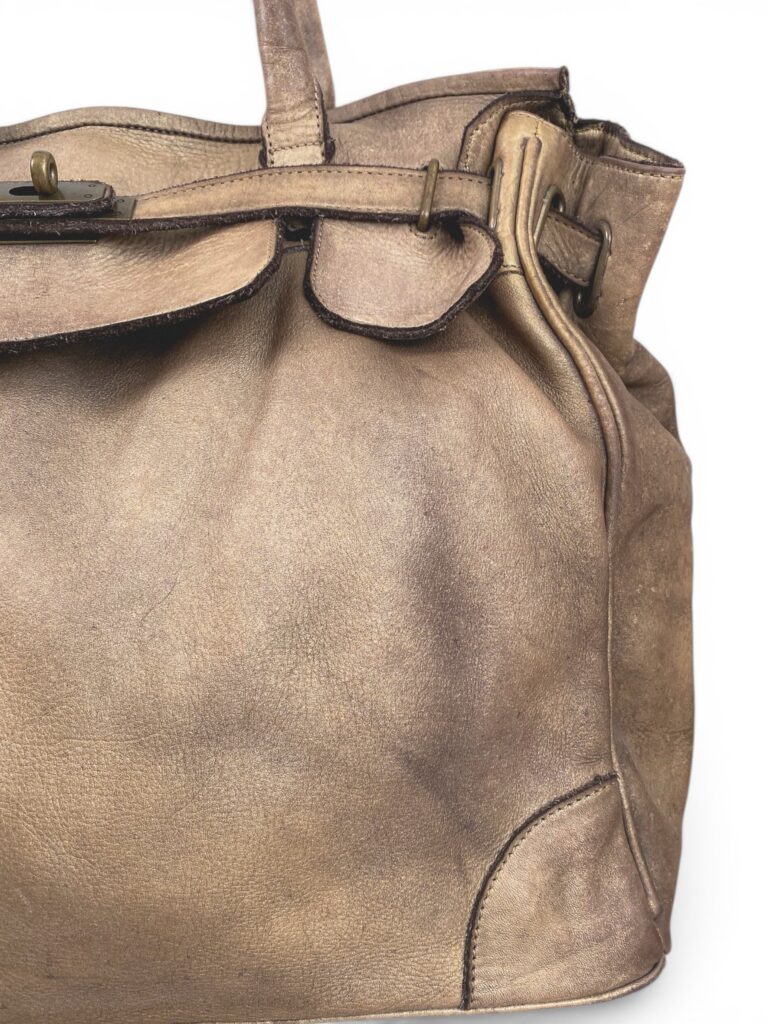 Bronze firkin bag with bronze hardware in beautifully aged genuine leather.