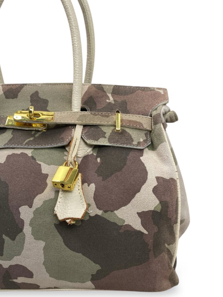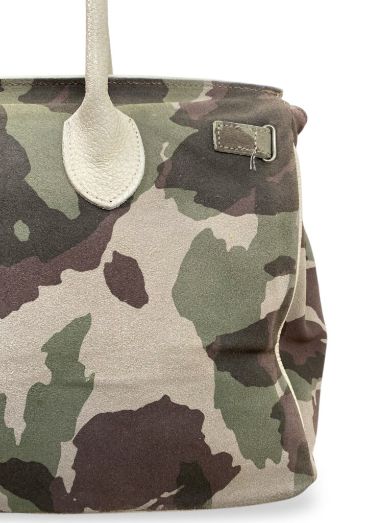 Camo suede firkin bag, with cream leather handles and gold hardware.