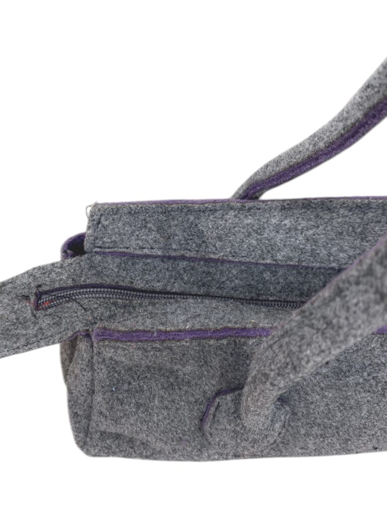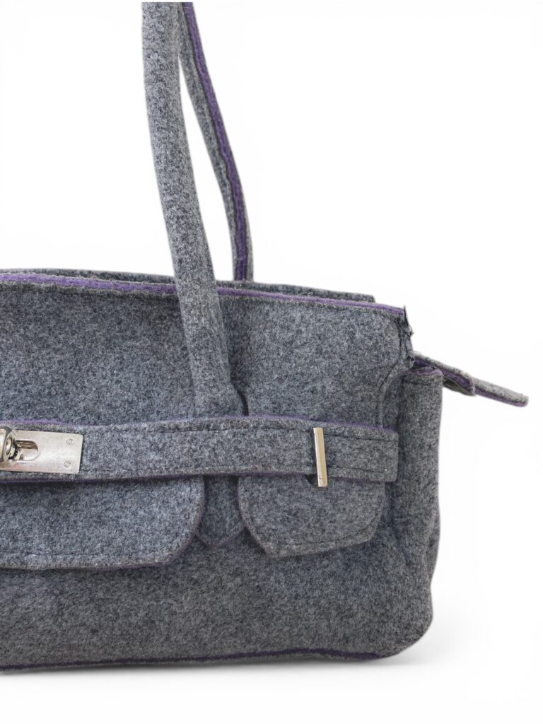 grey felt firkin shoulder bag with lilac details and silver hardware.