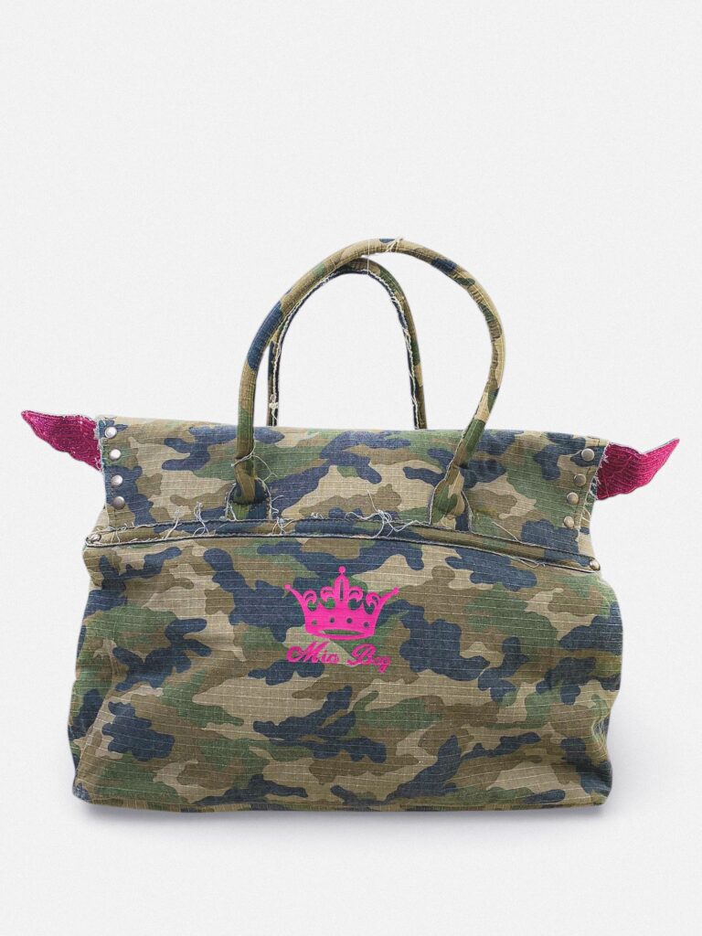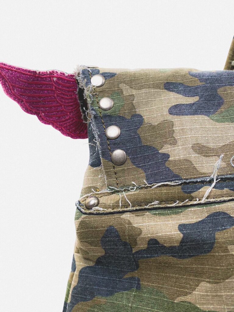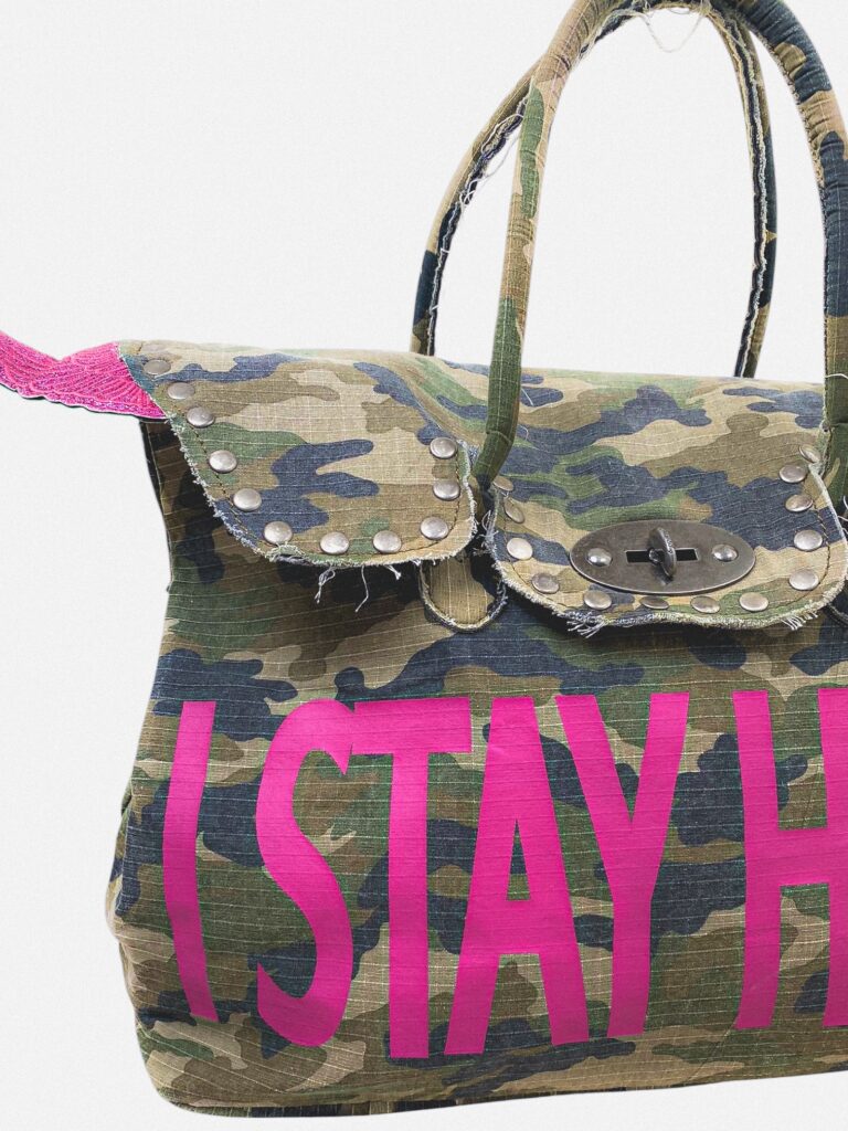 2010’s canva firkin handbag with camo print and glitter wings. Studded details and hughe “I STAY HIGH” print.