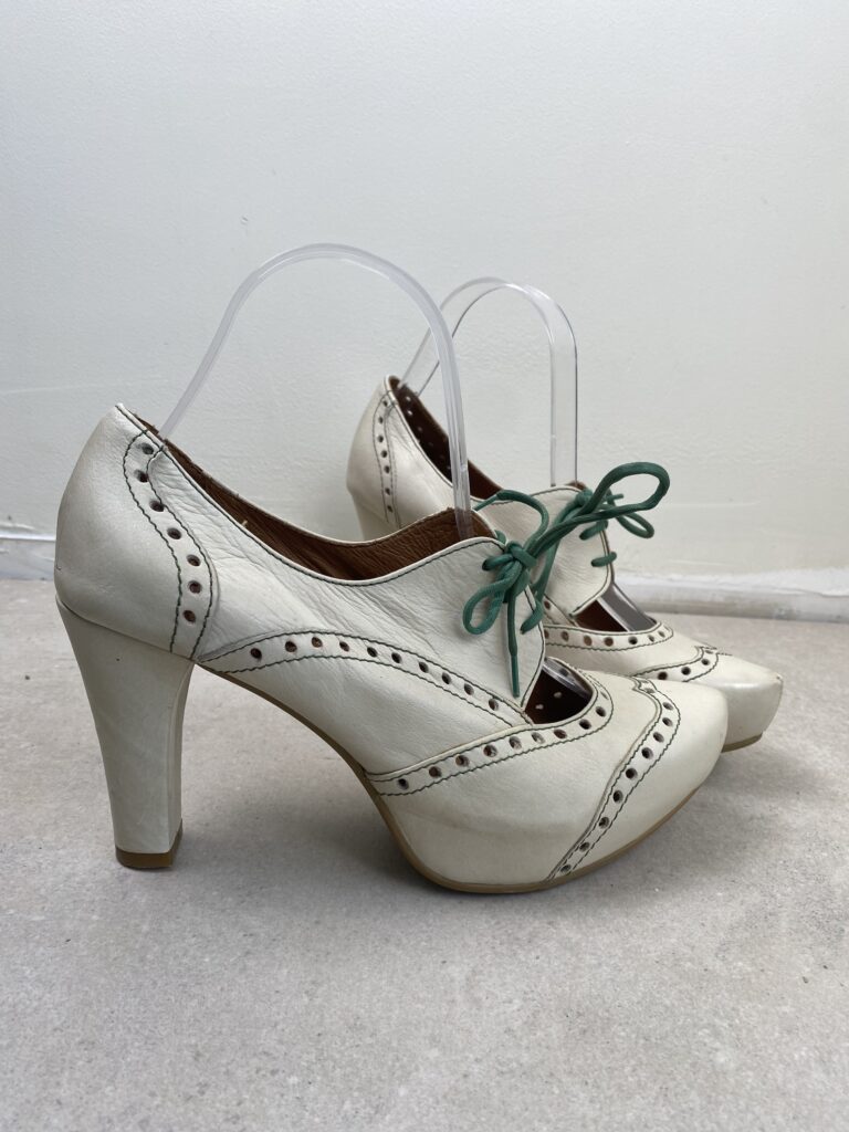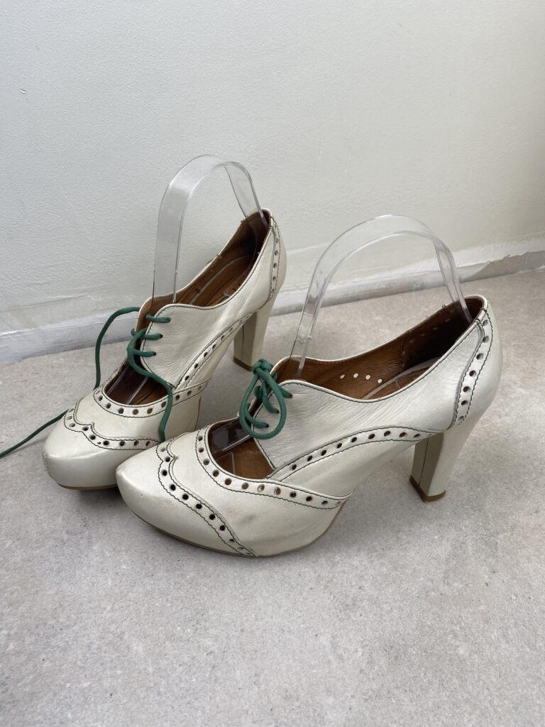 Retro inspired cream leather platform heels with teal lace-up ties. Accented by a delicate cut out and brogue perforations. Size : 39EU/240KO/5UK/7US