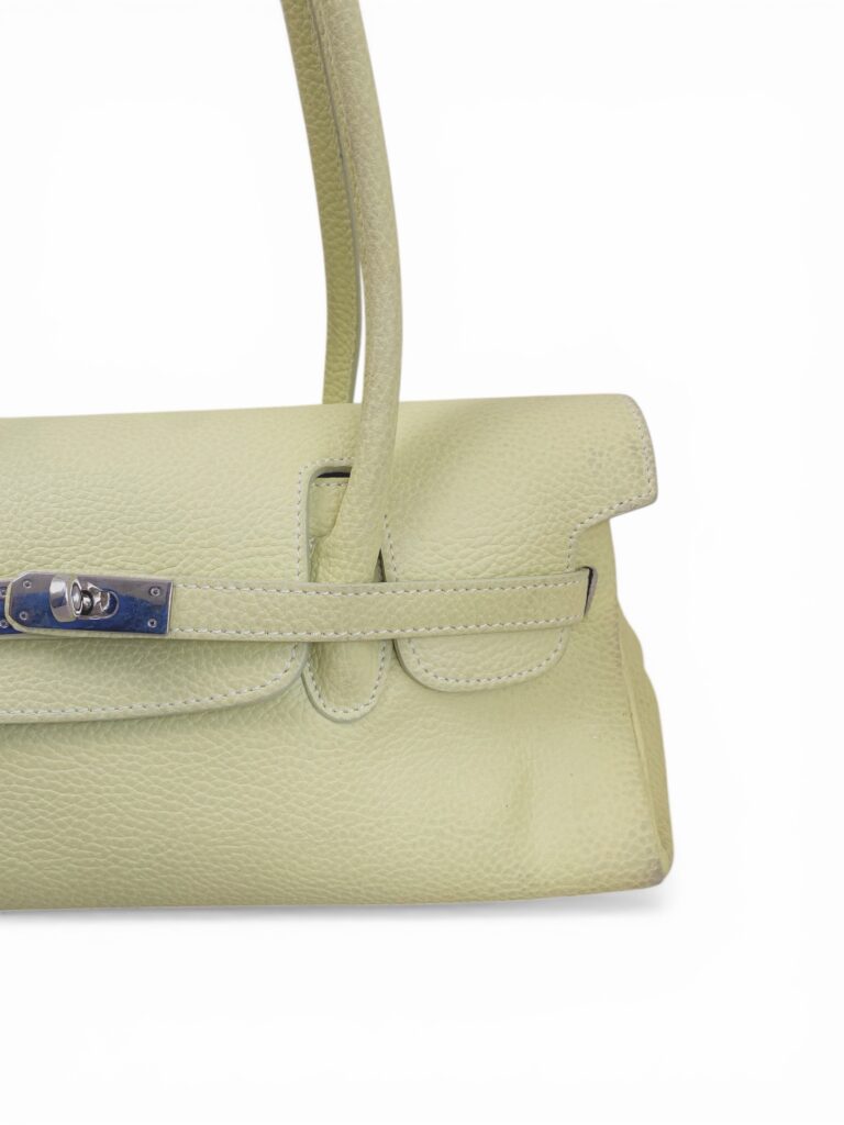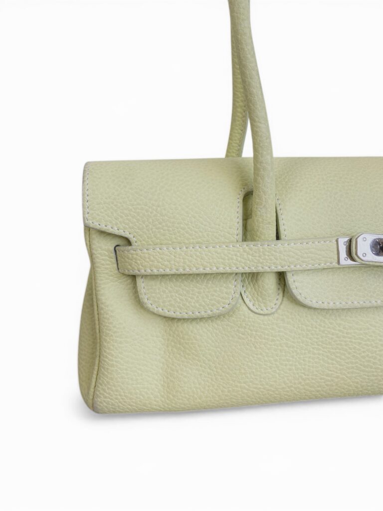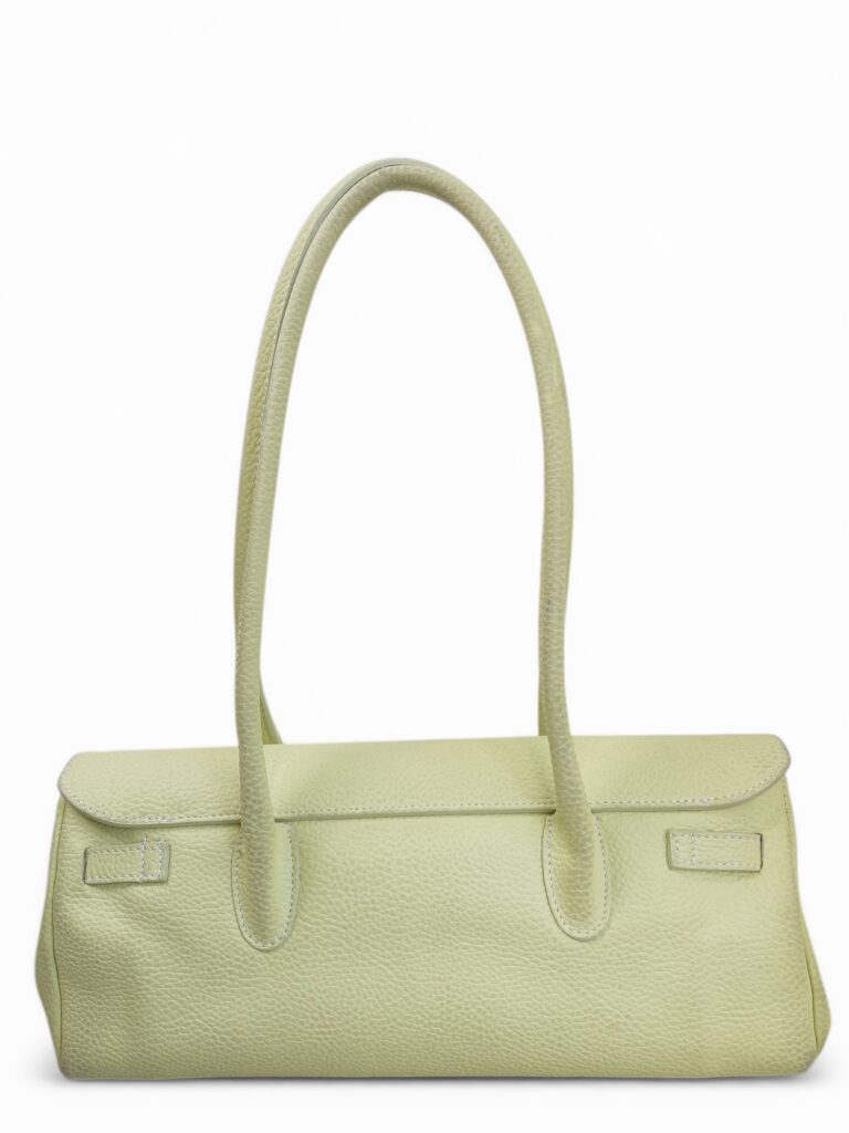 Palest lime color leather firkin shoulder bag in grainy leather with silver hardware