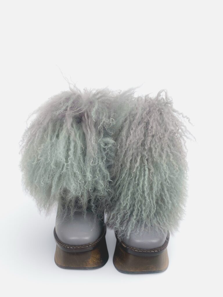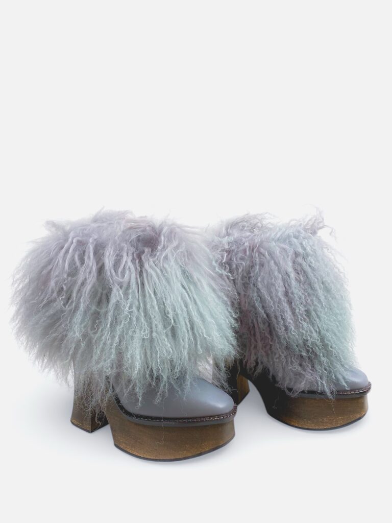 Coolest mongolian fur chunky low boots. Pale grey shoe with a thick platform wooden sole. Features an extra fluffy ‘leg warmer’ type of ornament all over the shoe.