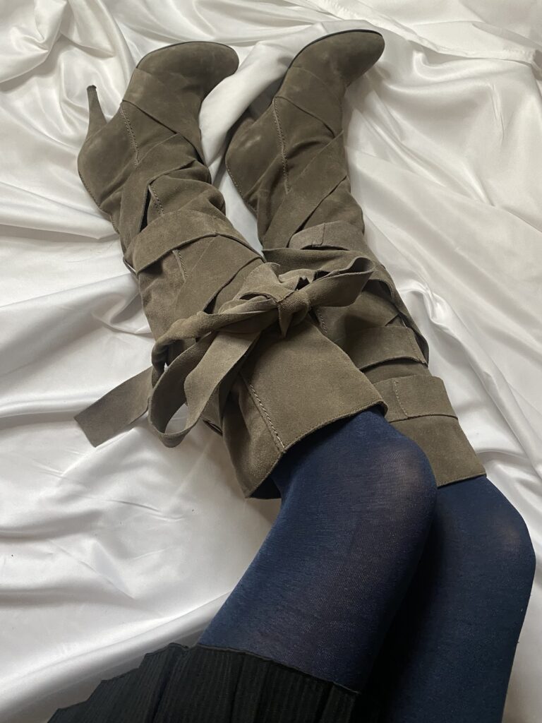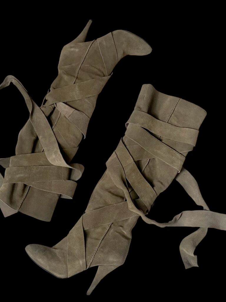 bondage style high heels italian designed boots. Features long straps all around the boot to adjust as you like. High quality suede material.