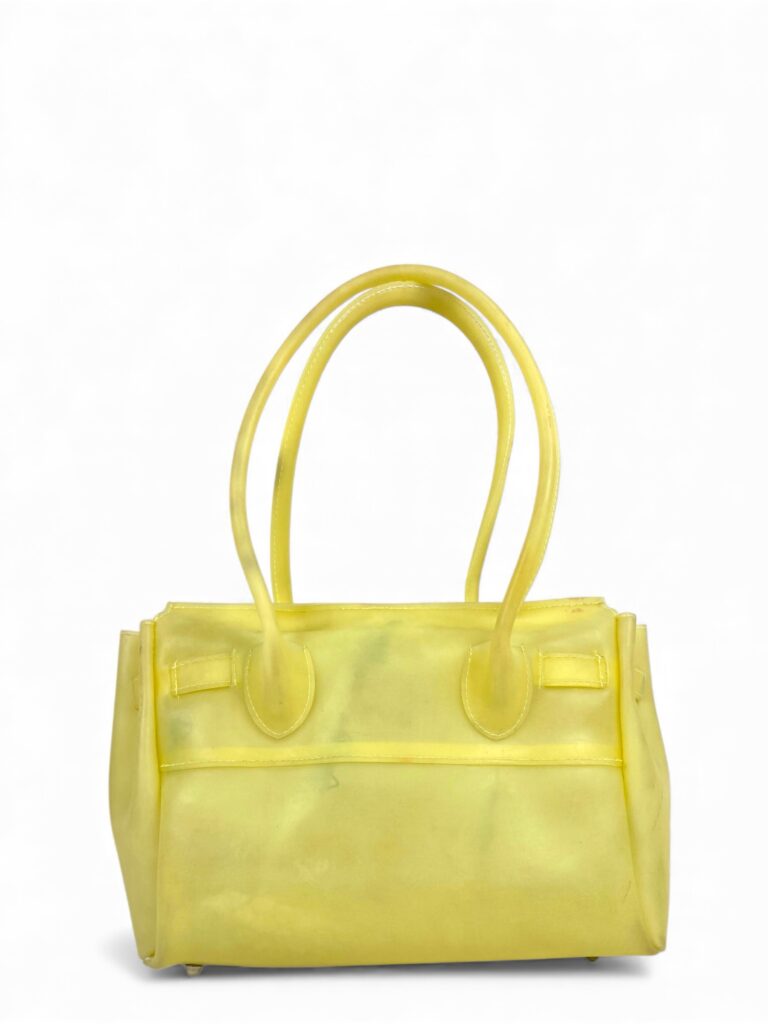 Pale yellow mini jelly firkin bag with silver hardware. Comes with original padlock and little key Measurements: 30x20x10 (handle drop: 18cm)