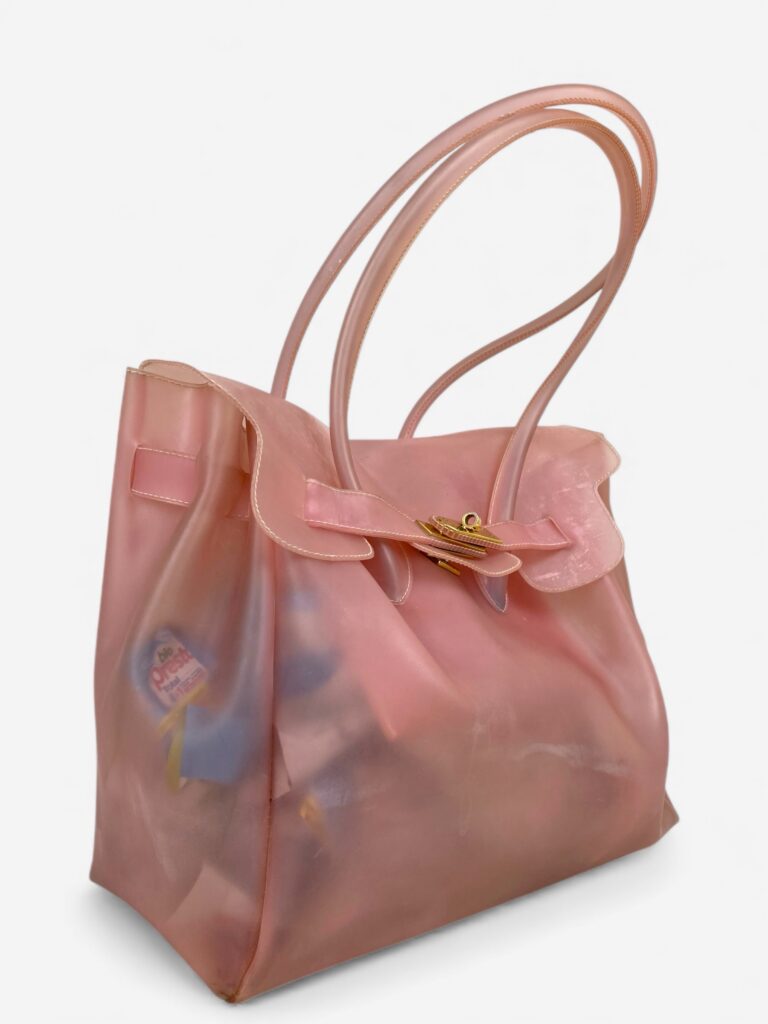 Pale pink see-through firkin bag with gold hardware. Measurements: 36x30x12 (handle drop: 21cm)