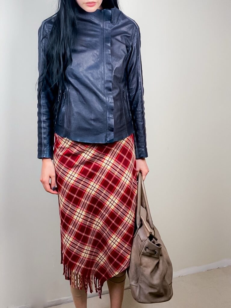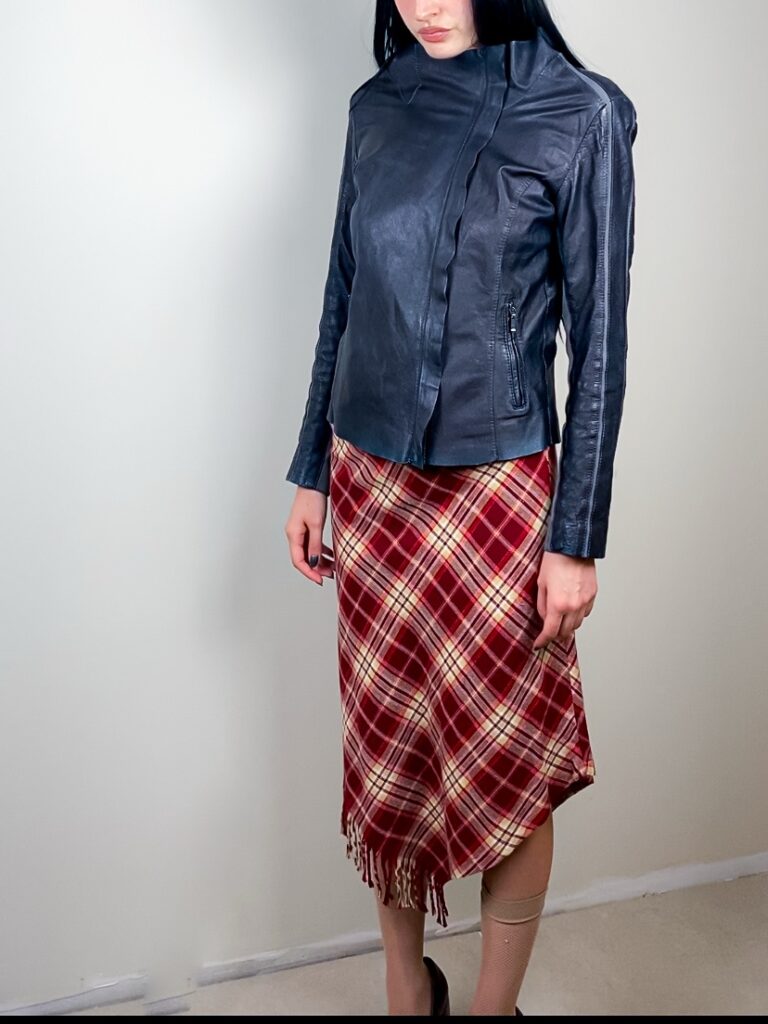 asymmetric midi skirt in red tartan fabric