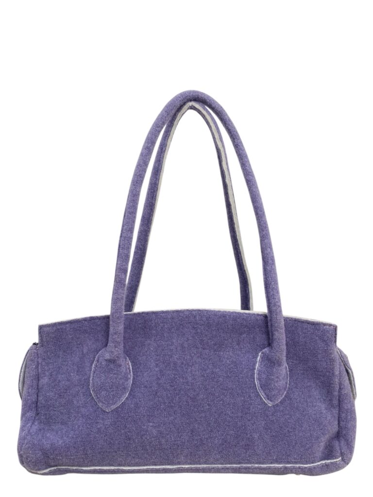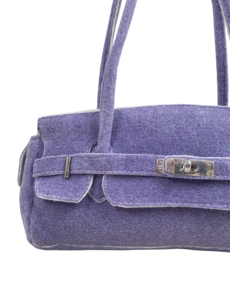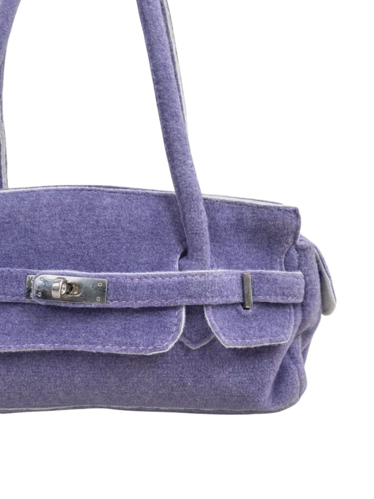 purple felt firkin shoulder bag with silver hardware. Measurements: