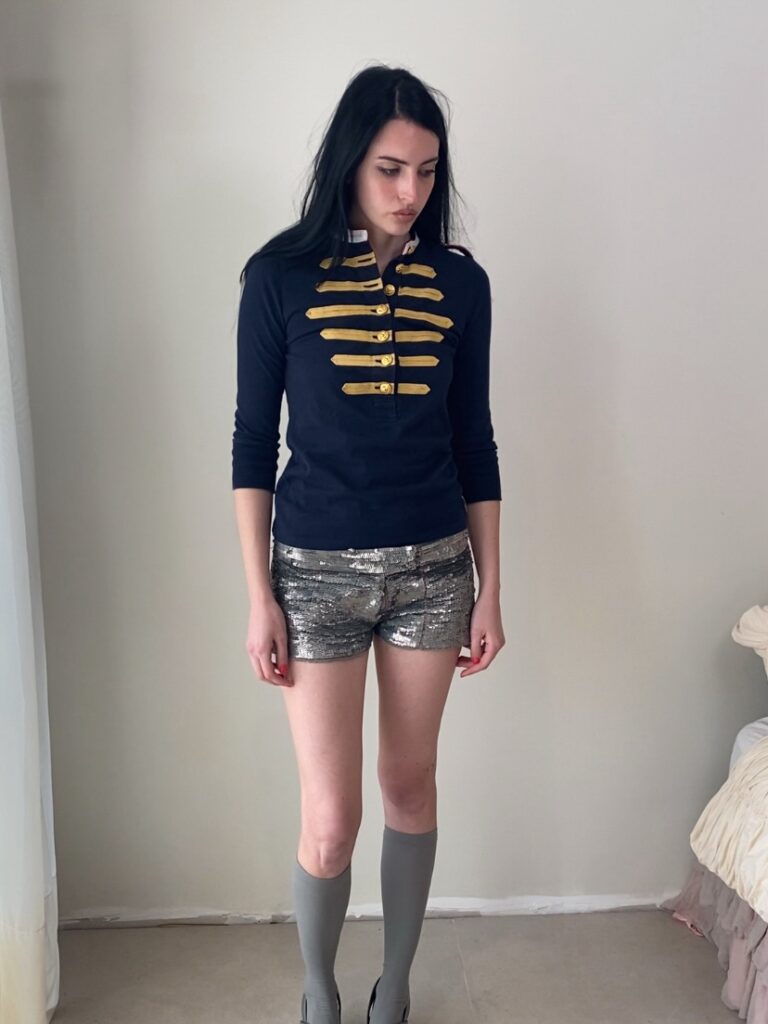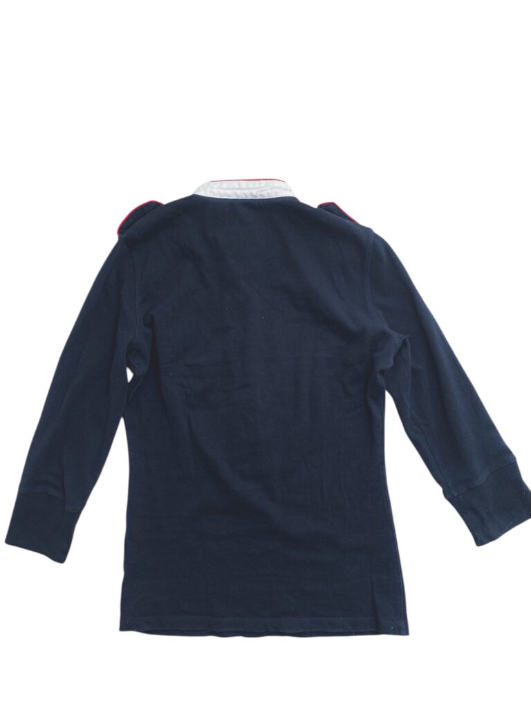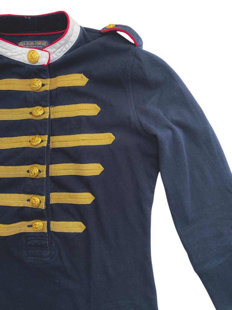 Ralph Lauren 3/4 sleeved marine polo with golden officer chest details and round collar.
