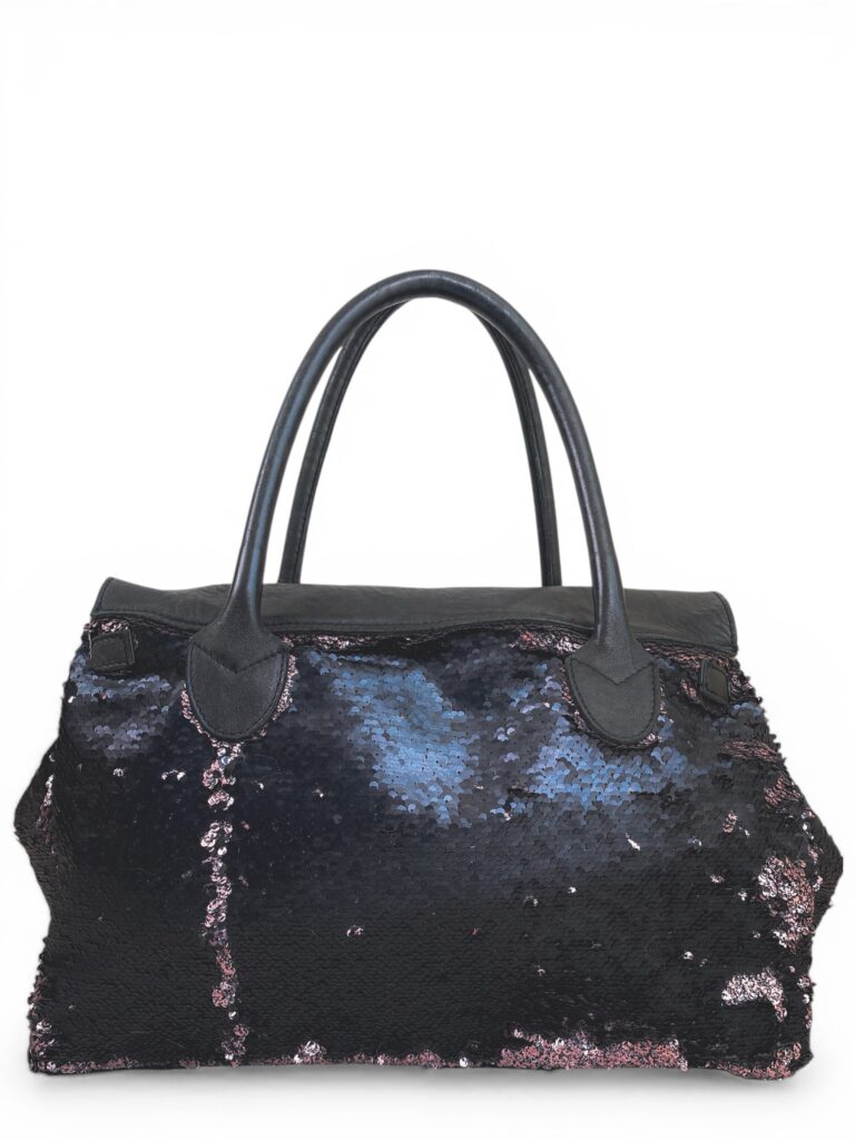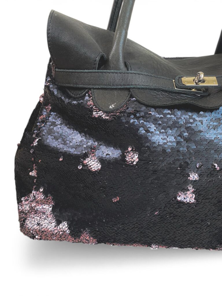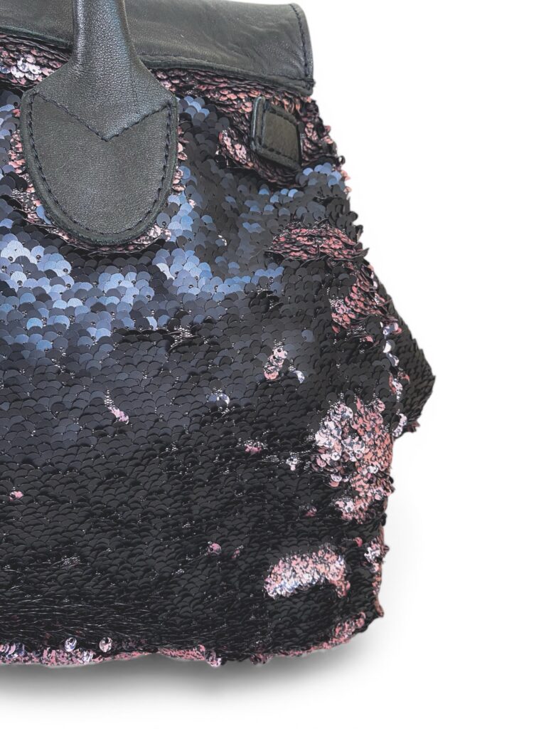 large sized pink and black firkin made of sequins material and black leather closing, with silver hardware. Very sensorial item : you can play with the sequins that are pink on one side and black on the other.
