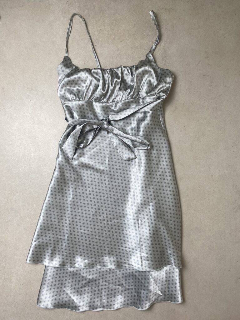 Italian designer light grey starry printed mini dress in satin with lace up detail. Double layered with inside lining. Empire type of waist .