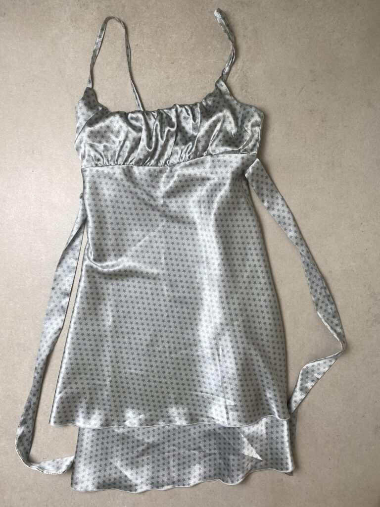 Italian designer light grey starry printed mini dress in satin with lace up detail. Double layered with inside lining. Empire type of waist .