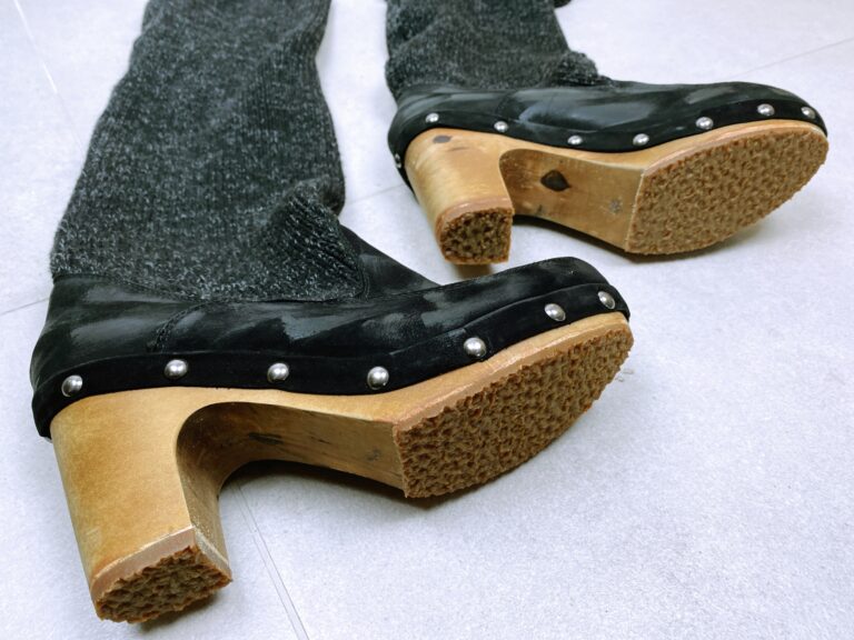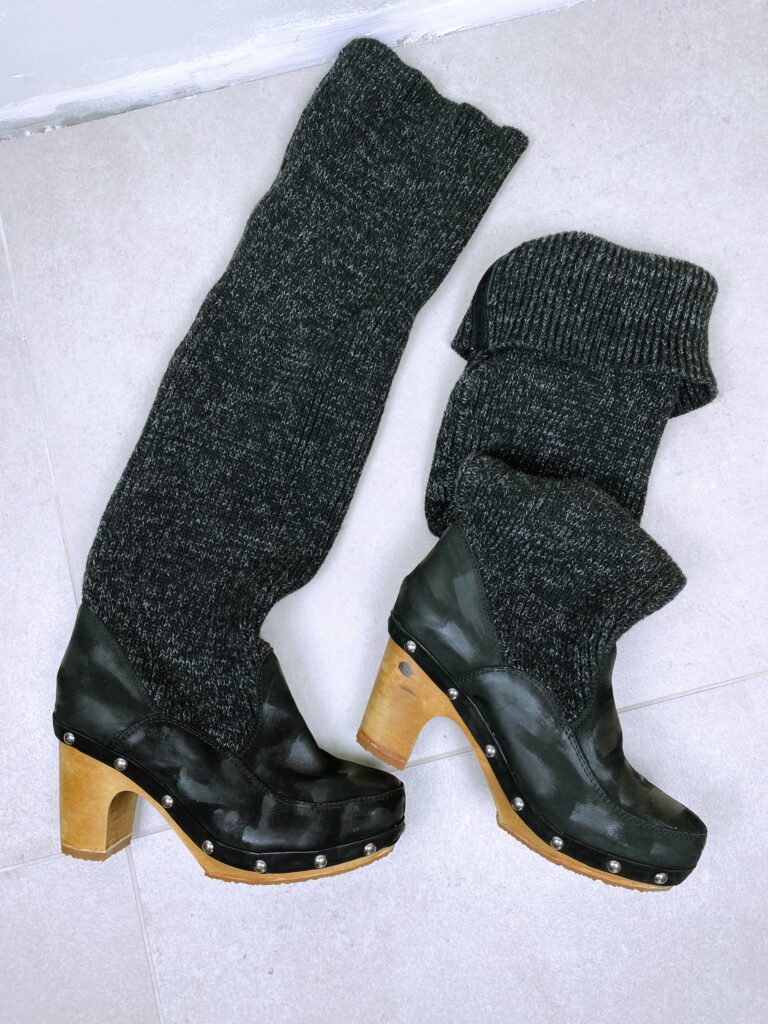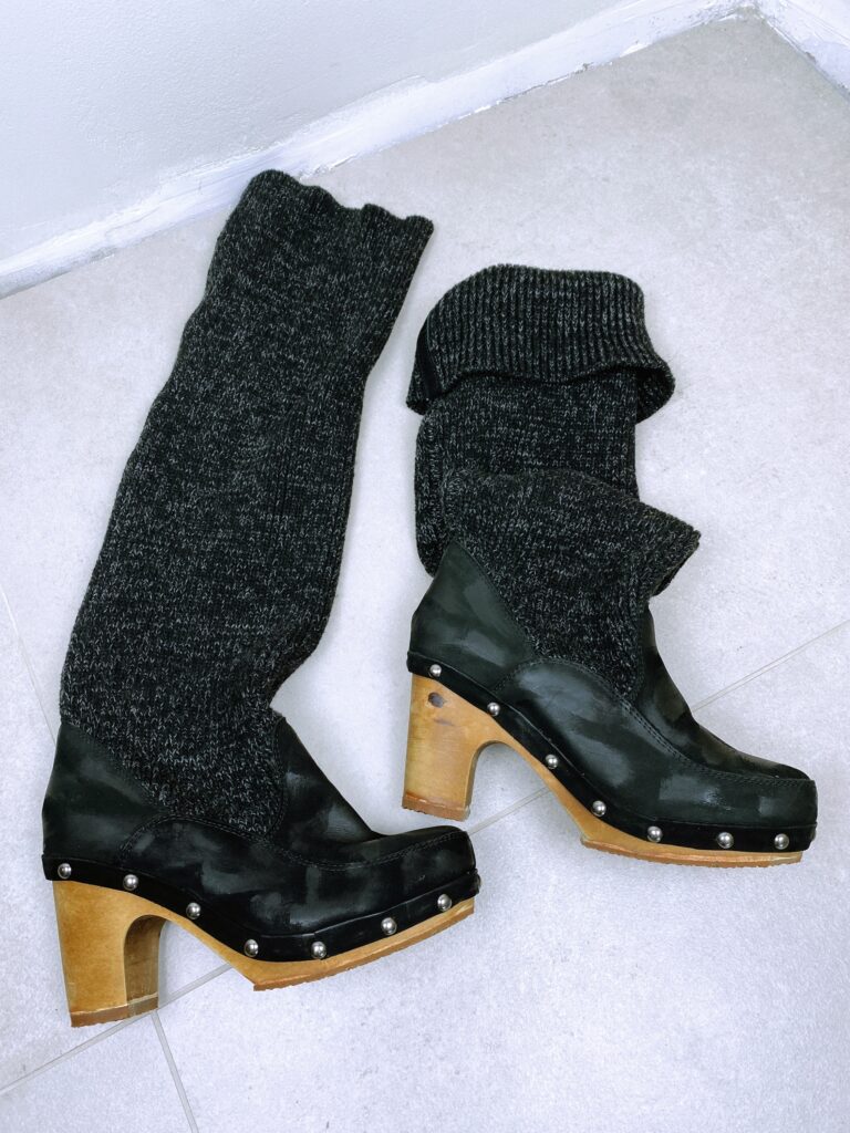 High heeled boots with clog sole and dark grey chinĂ© body. Fresh out of the cobbler.Â