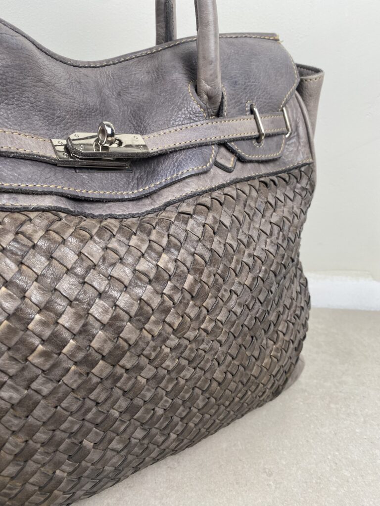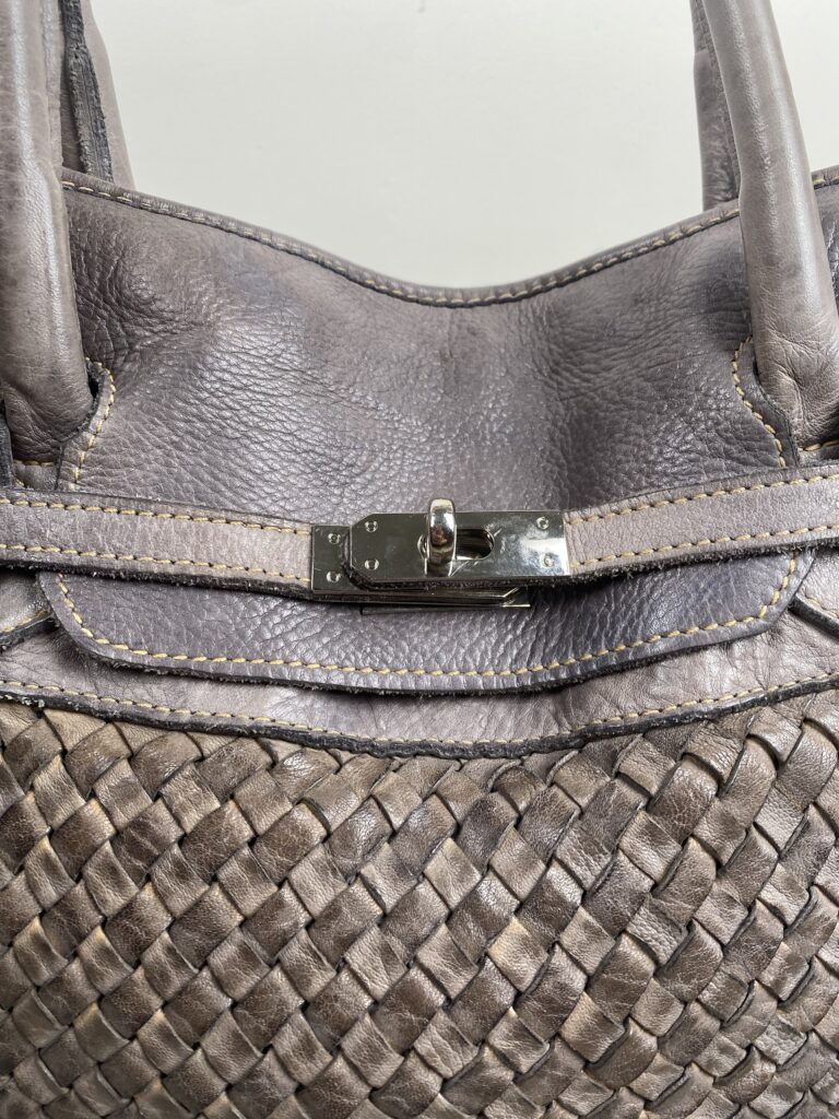 Dark grey (with purple hues) leather firkin bag with woven panel.