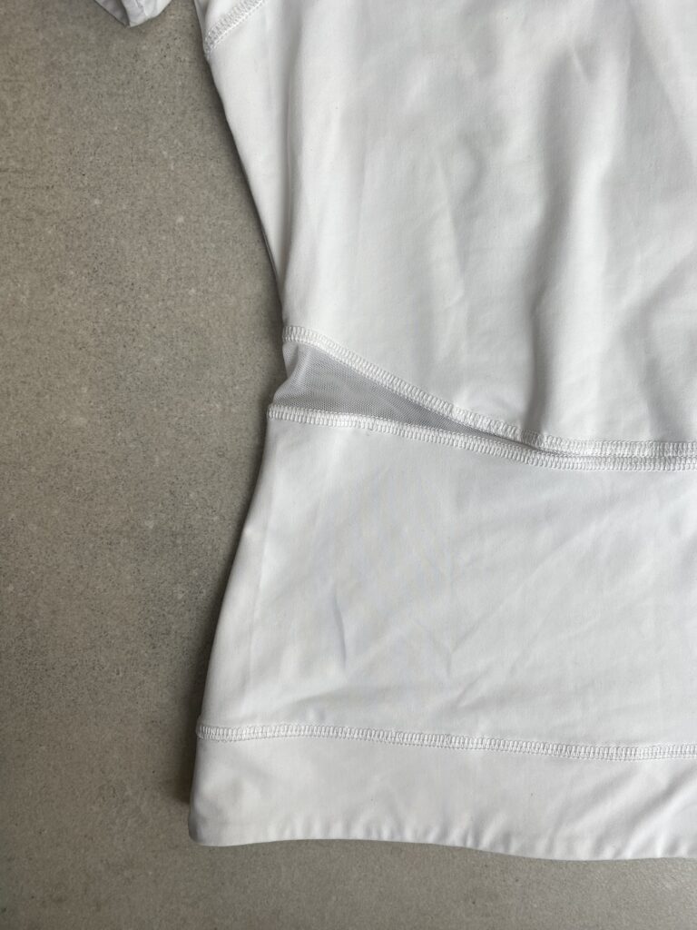 White tee-shirt with mesh placements on collar and waist.