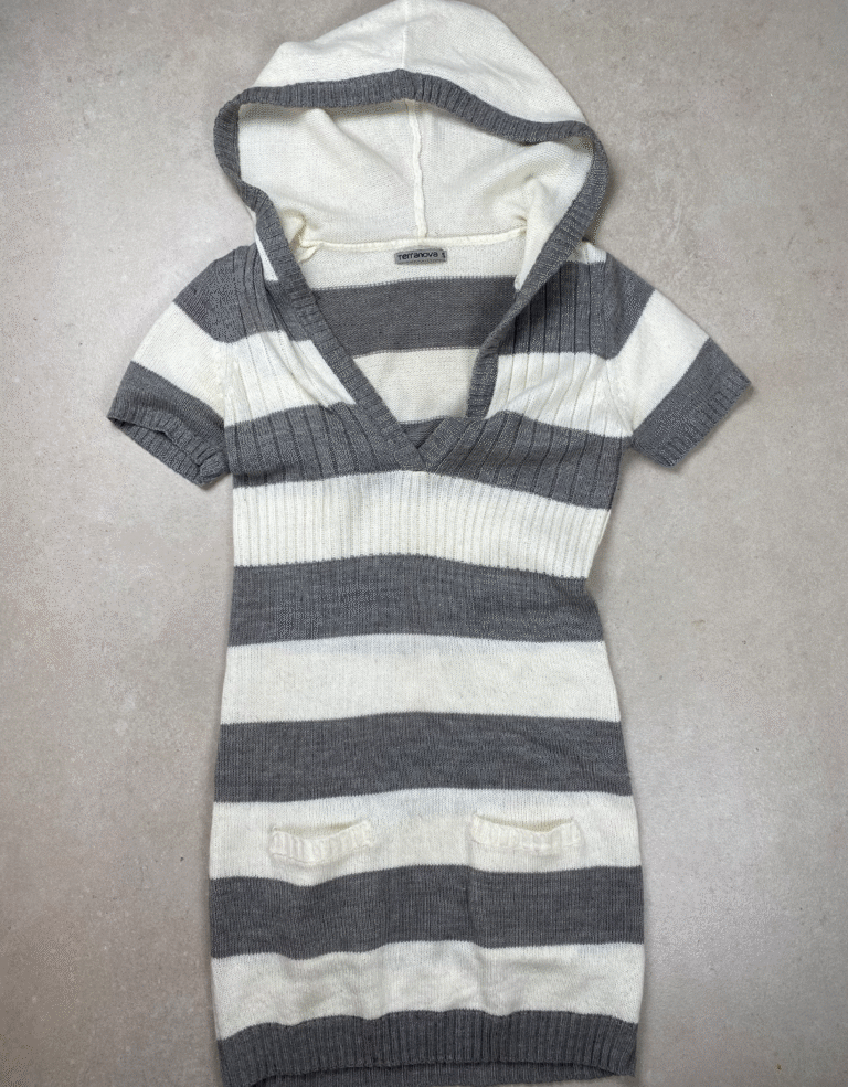 Grey and white knitted dress with polo silhouette, ribbing detail, pockets and hood