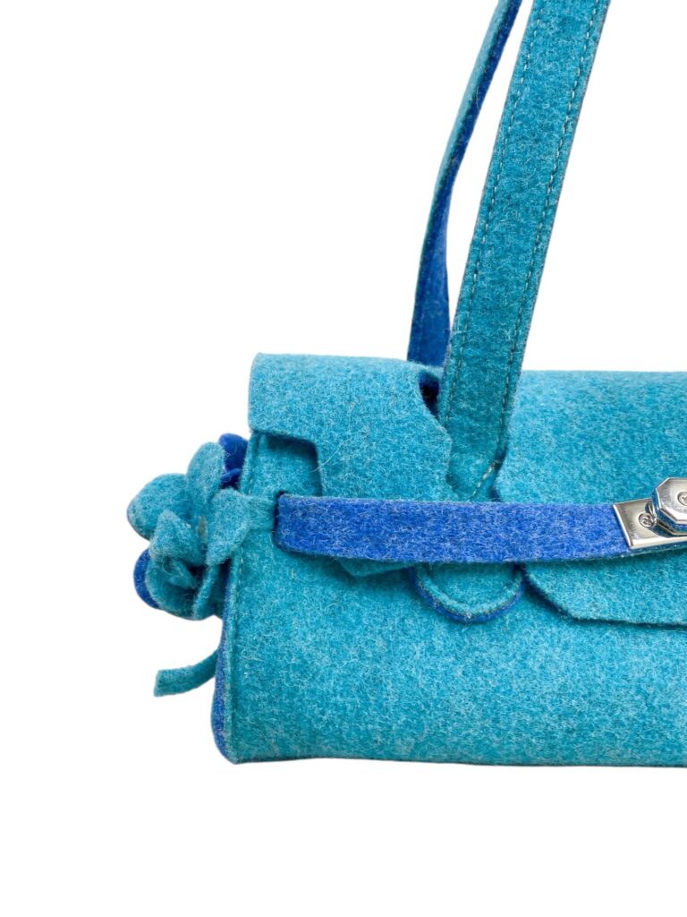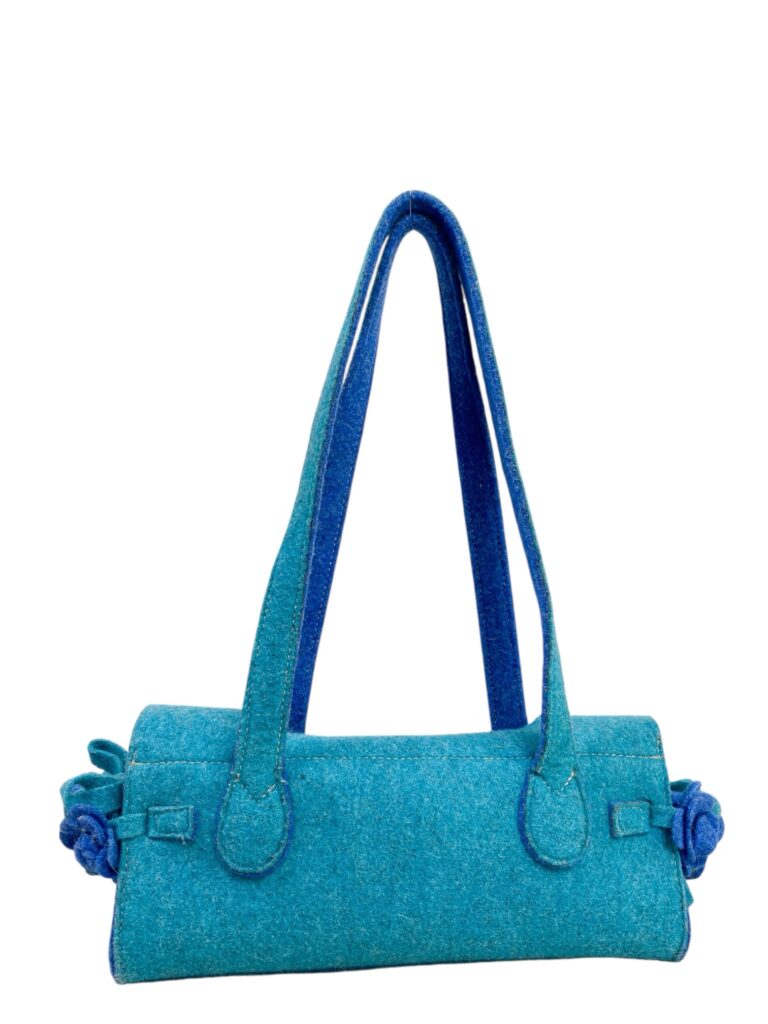 Duo tone felt firkin shoulder bag in teal colos with flower ornaments and silver hardware.