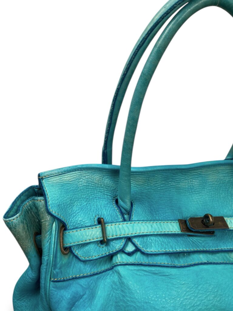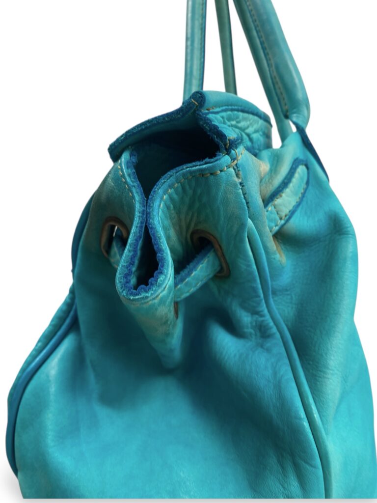 Turquoise blue firkin bag in genuine leather with bronze hardware. Measurement: 42x36x17cm (handle drop : 19cm)